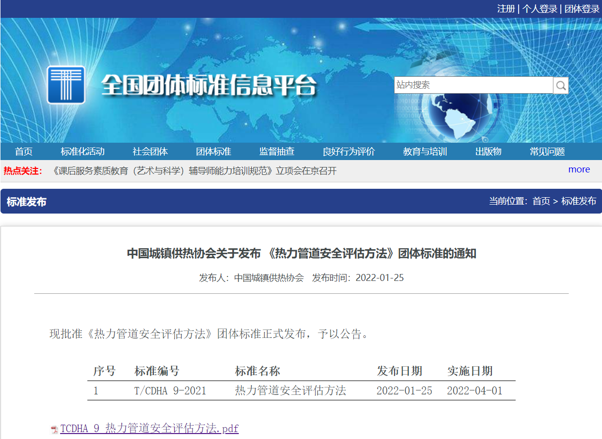盾安(天津)节能系统有限公司参与编制的团体标准T/CDHA 9-2022《热力管道安全评估方法》近日正式发布,于2022年4月1日起正式实施。