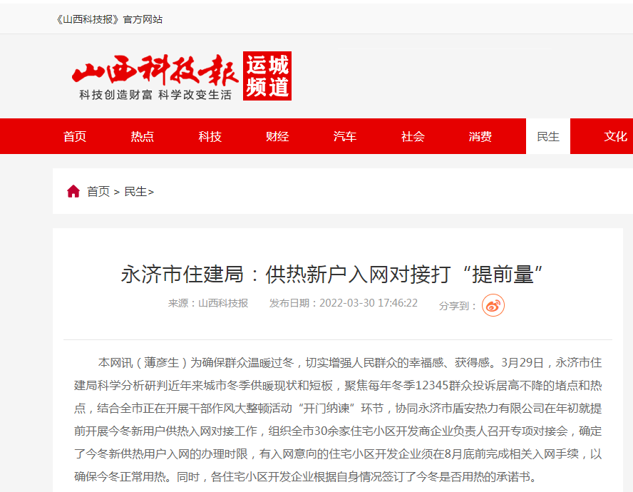 《山西科技报》点赞盾安永济热力公司 助力供热新户入网对接打“提前量”