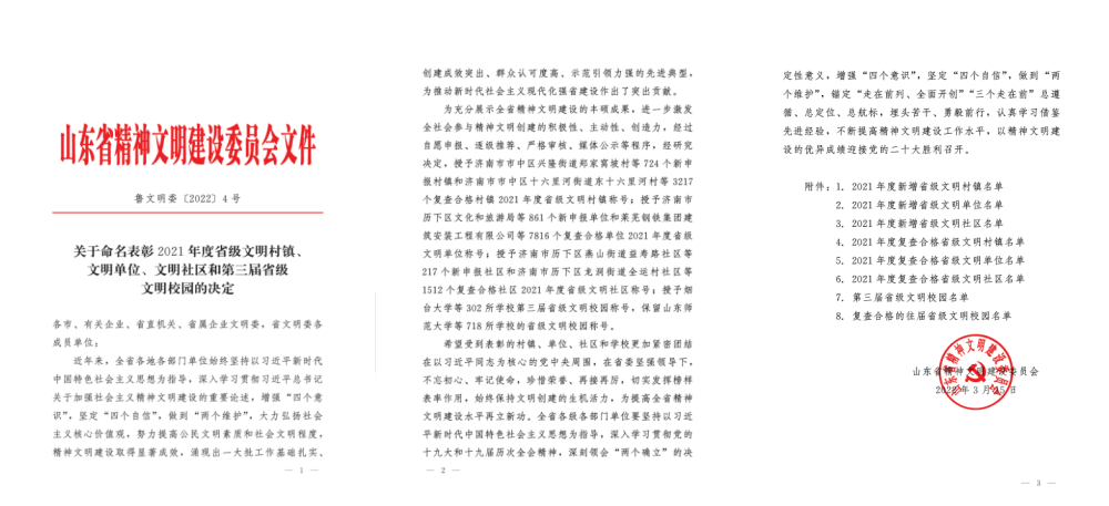 3月15日,山东省精神文明建设委员会印发《关于命名表彰2021年度省级文明村镇、文明单位、文明社区和第三届省级文明校园的决定》,304永利集团被正式授予省级文明单位荣誉称号。